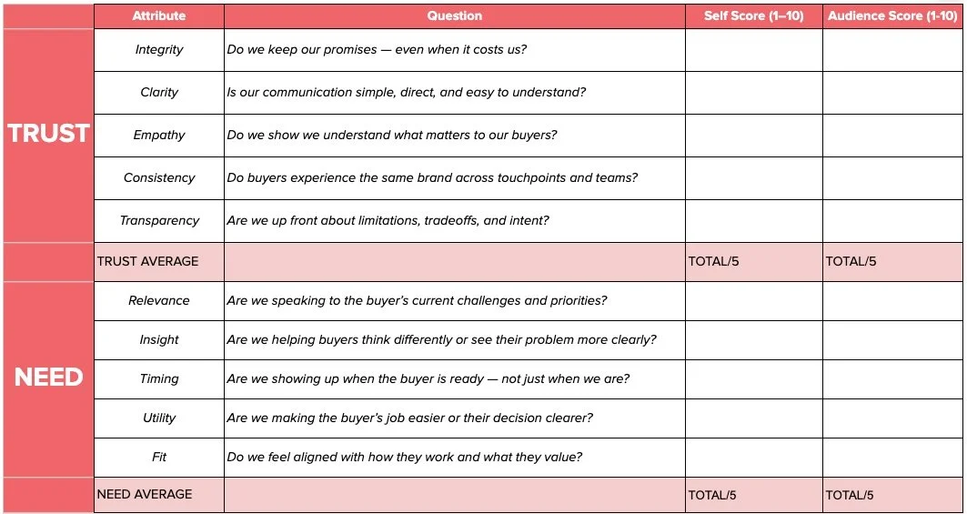 Calculate your Average Trust Score (the average of the 5 trust-related attributes) and your Average Need Score (the average of the 5 need-related attributes).